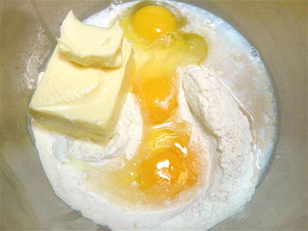 OK, everything into the bowl. Flour, sugar, dry milk, salt, yeast, water. Lots of room-temperature butter. Three large eggs, plus an extra yolk.