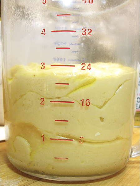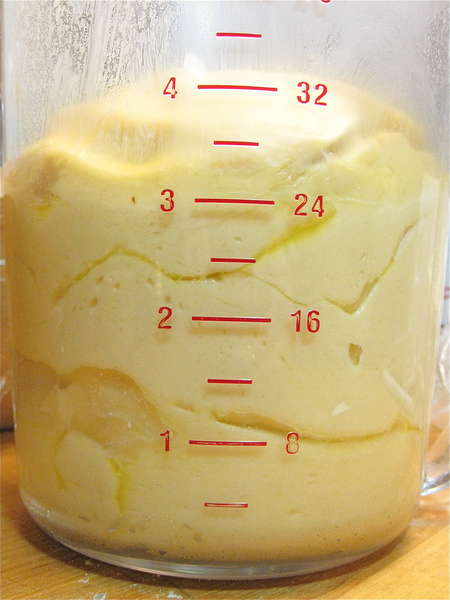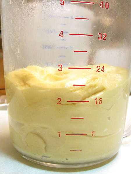 Put the dough in a rising container. I’m using an 8-cup measure here. The container really doesn’t need to be greased; this dough is rich enough.