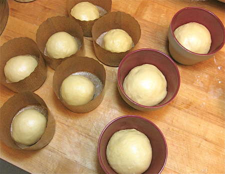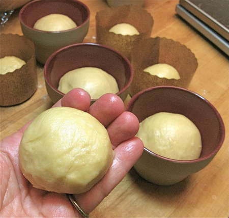 Round the pieces of dough into smooth balls, and set them in the pans, filling the pans anywhere from about 1/3 to a generous 1/2 full.
