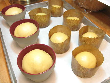 Remove it from the rising vessel, and divide it into as many brioche as you want to make. This recipe makes two nice loaves; six “flower pot” brioche; or a dozen little rounds, in our bake and give mini round paper pans. You may also choose to make a traditional large loaf in a brioche pan; I didn’t have a brioche pan, so didn’t try it.