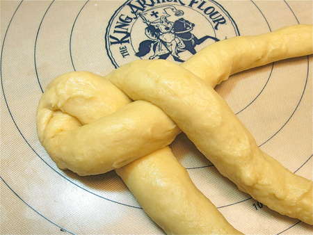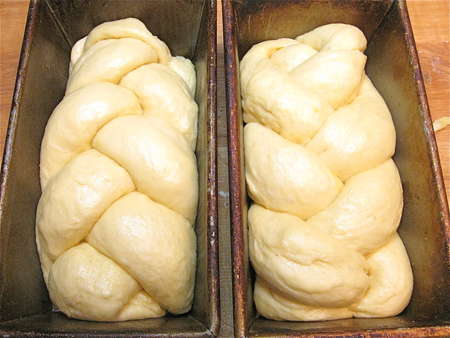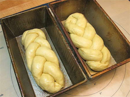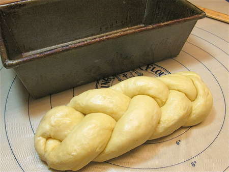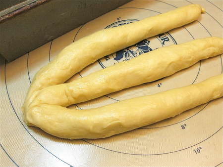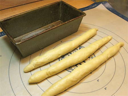 Scrape the dough out of the bucket, and divide it in half. You’ll be making two loaves. Divide each half into three pieces, and roll them into ropes about 11” to 12” long. Ready two 8 ½” x 4 ½” loaf pans by spraying with non-stick vegetable oil spray.