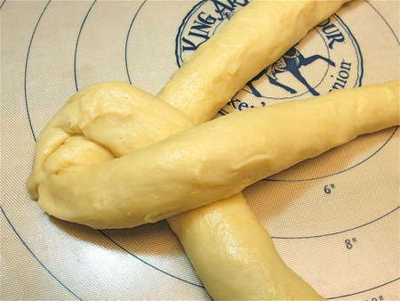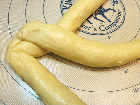 Continue until you’ve made a braid. Tuck the ends underneath. Repeat with the other half of the dough.