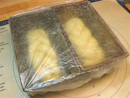 Nestle the two loaves in the pans. They’ll seem pretty skimpy; that’s OK. Warning: If you use a 9” x 5” pan, they’ll seem REALLY skimpy, and won’t fill the pan when they rise and bake. Please try to use 8 ½” x 4 ½” pans.