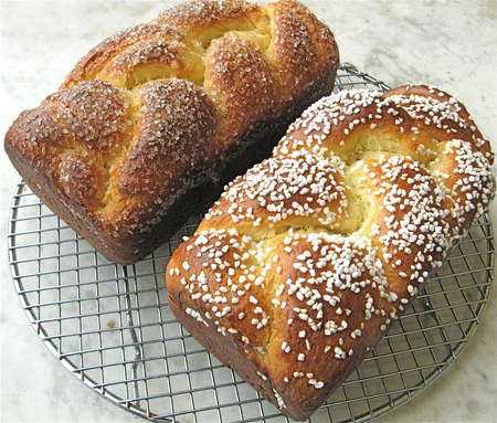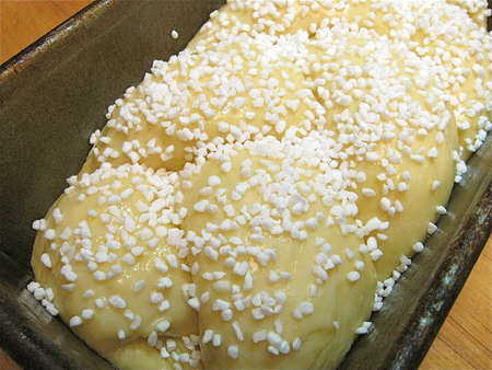 Sprinkle with sugar, if you like. I’m using Swedish pearl sugar here; I find it very pretty against the deep mahogany brown color of the baked brioche.