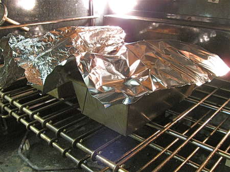 …then tent with foil, and continue to bake till the center feels set when you insert a cake tester or toothpick. It won’t feel sticky inside, and the tester will side out easily.