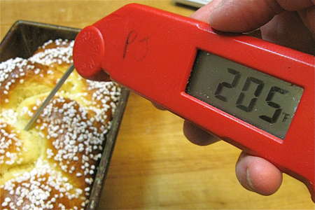Remove the loaves from the oven when they’re a medium-to-deep golden brown, and their interior temperature reads about 205°F on an instant-read thermometer.