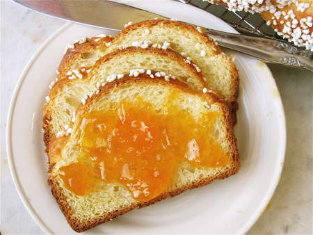 Here’s my favorite way to enjoy brioche: made into a loaf, sliced, and served with jam. Apricot is my favorite.