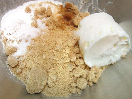 Add brown and white sugar, salt, baking powder, and vanilla.