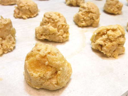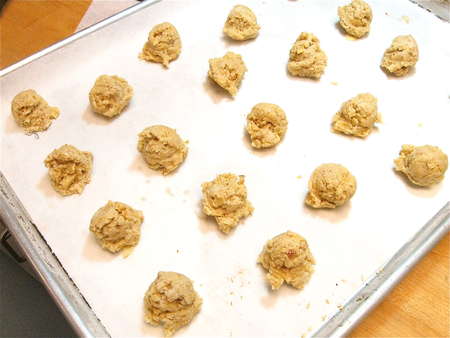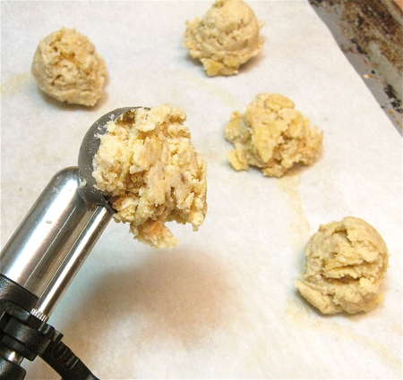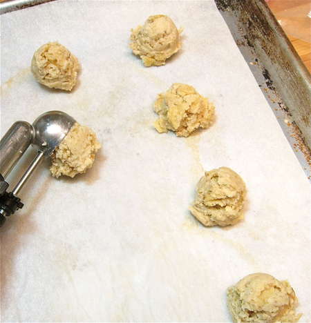 Use an overfilled teaspoon cookie scoop (or use a spoon) to deposit chestnut-sized balls of dough onto a parchment-lined or lightly greased baking sheet.