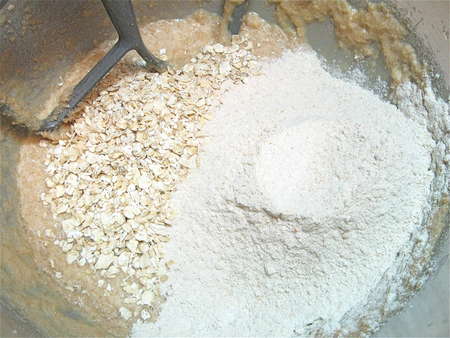 Add the golden wheat flour and oats, and mix till thoroughly combined. NOW the batter will be smooth, aside from the oats. Add cinnamon chips or cinnamon sweet bits.