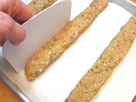 Use a sharp chef's knife to slice the biscotti crosswise, making 1/2” to 3/4” wide slices. This is a change from the usual “slice diagonally with a serrated knife” method. Since you're cutting crosswise (to make short biscotti) rather than diagonally, they're small enough to cut easily in one fell swoop, no sawing needed. If they seem to be crumbling a lot, let them cool a bit longer.