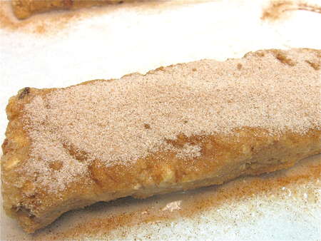 Bake the logs for 23 to 25 minutes, until they're starting to brown around the bottom edges. Remove them from the oven, and let them cool for about 15 minutes, right on the baking sheet. Spritz with water, sprinkle with additional cinnamon-sugar, if desired, and let them cool an additional 10 to 15 minutes.