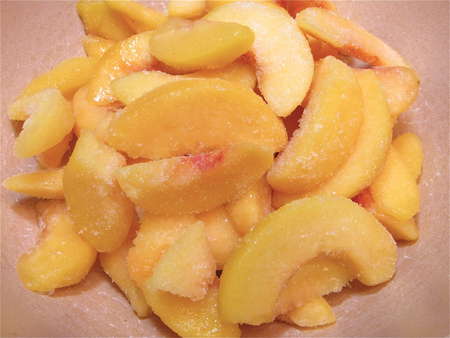 Dump the frozen peaches into a bowl. Let them thaw a bit; they don't have to be completely unfrozen, just soft enough to chop.