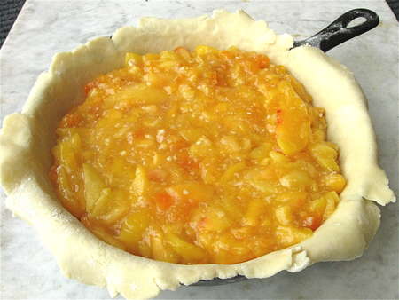 Two 16-ounce frozen bags of peaches combined with a cup of chopped dried apricots makes the basis for a tasty filling. Why the apricots? They play beautifully with peaches, adding depth of flavor and enhanced texture.