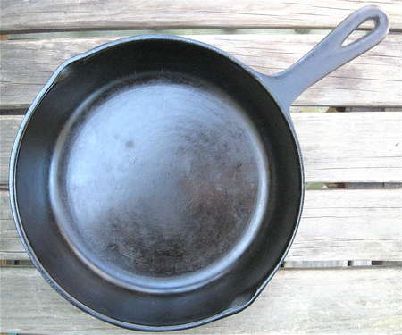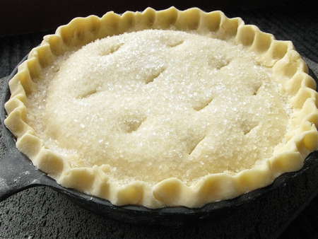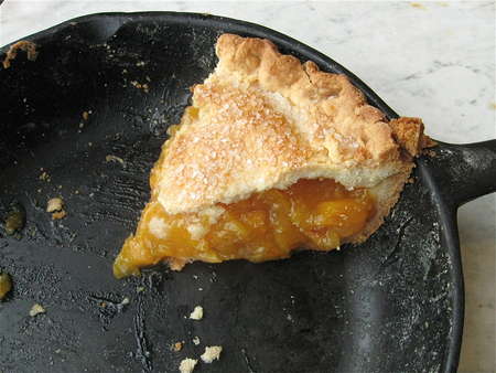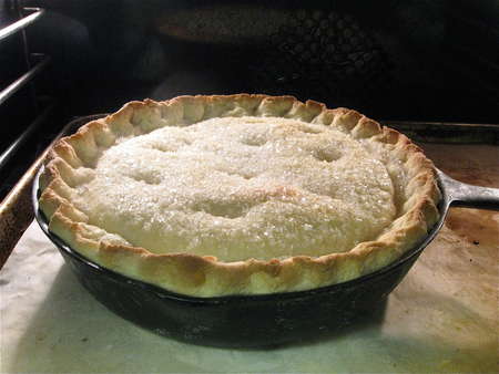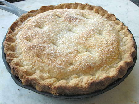 Here's my new favorite pie pan: a 9" cast-iron skillet. Notice its sheen; that's the result of a quick rubdown with shortening after each use. This particular pan was given to me 30 years ago by a 90-year-old friend; it had belonged to his mother. So you can imagine how old this pan is, and how many meals it's cooked.