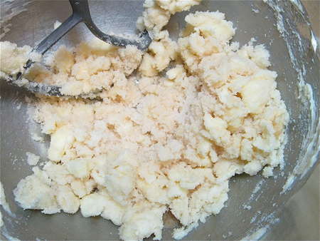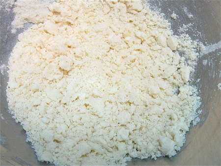 Combine melted butter, flour, confectioners' sugar, salt, and vanilla. Mix till uneven crumbs form. Pay close attention: if you mix too long, instead of crumbs you'll have a solid mass.