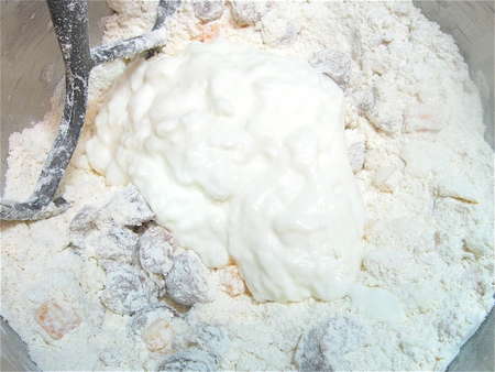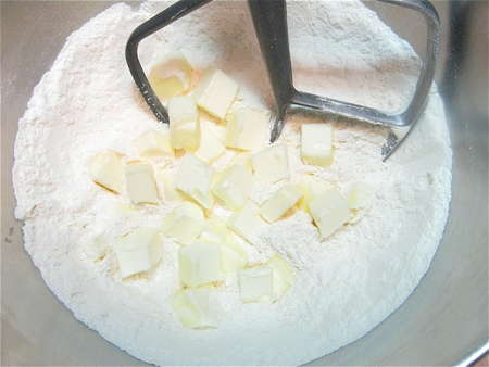Whisk together unbleached all-purpose flour (King Arthur, of course; it does make a difference); baking powder, baking soda, and salt. Add cold butter, cut in pats or chunks.