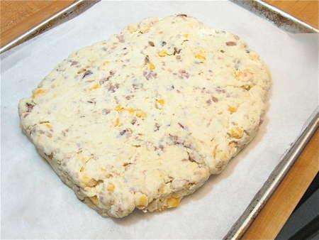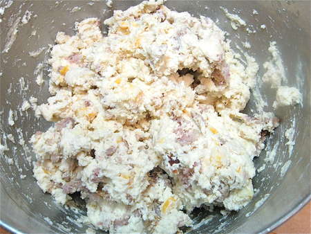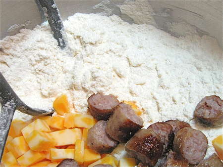 Once the butter has been roughly mixed in (leaving a few largish, marble-sized chunks), add the cheese and sausage.