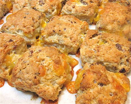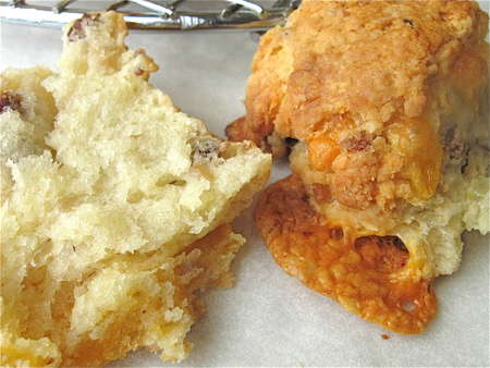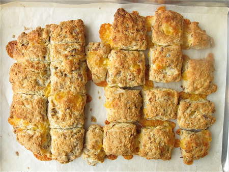 And here's the result of the experiment. No difference in pulling them apart, other than that the scones on the right had crispier sides, and the oozing cheese had a chance to get crusty.