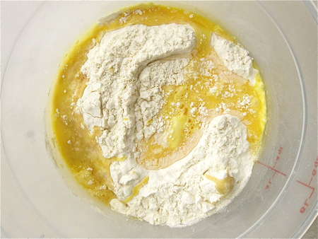 My version of Nik's "big plastic bowl" is our 6-quart dough-rising bucket. In go the flour, salt, yeast, water, eggs, honey, and vegetable oil.