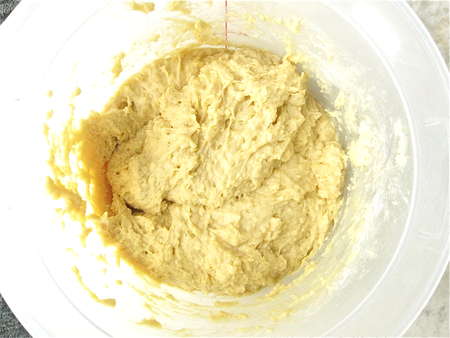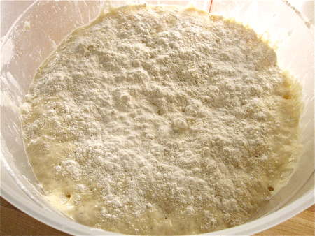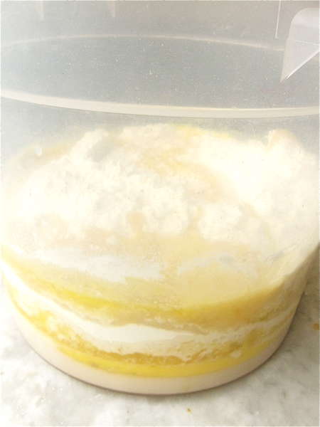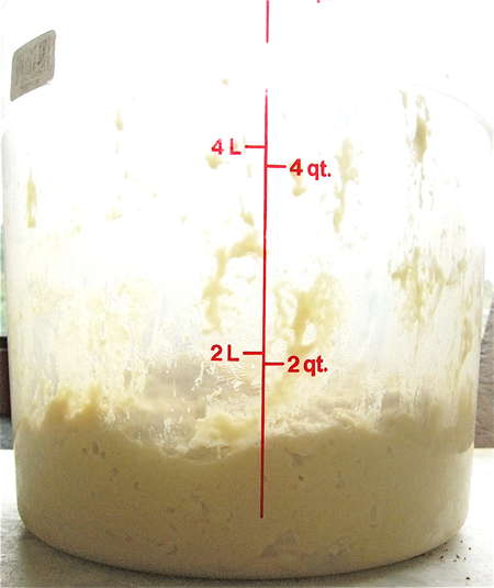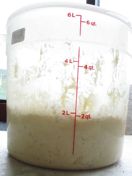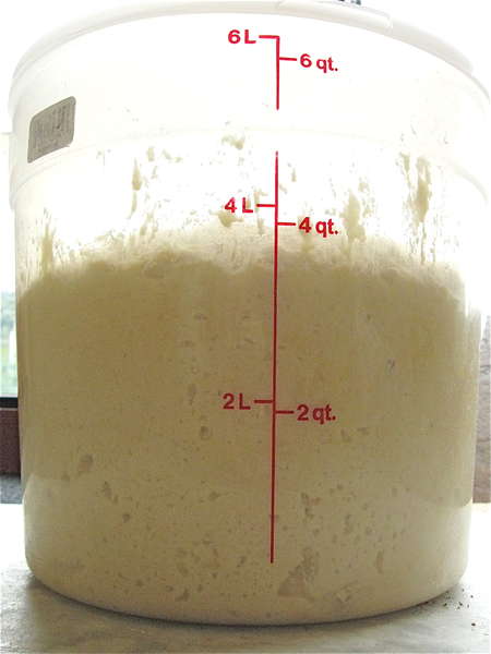 Put the lid on the bucket, and let the dough rise for 2 hours at room temperature. Here it is at the start of the rise...