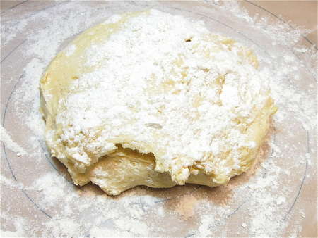 Place the dough on a well-floured work surface; a silicone mat works well here. Sprinkle more flour on top.