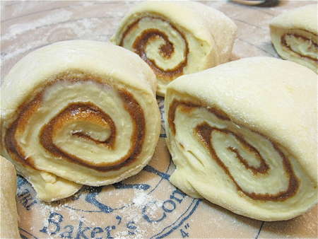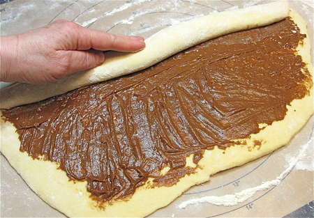 Spread the filling on the dough, and roll it up starting with a long (15") side. Don't be over-zealous and roll it super-tight; if you do, the centers of the buns will pop up as they bake. Be firm, but gentle.