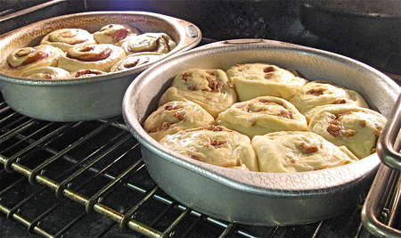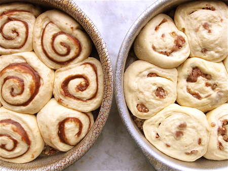 I used two 22-ounce pieces of dough to make two pans of buns side by side here, testing different fillings. The filling on the right is a caramel-nut filling you'll find in the Five Minutes a Day recipe.