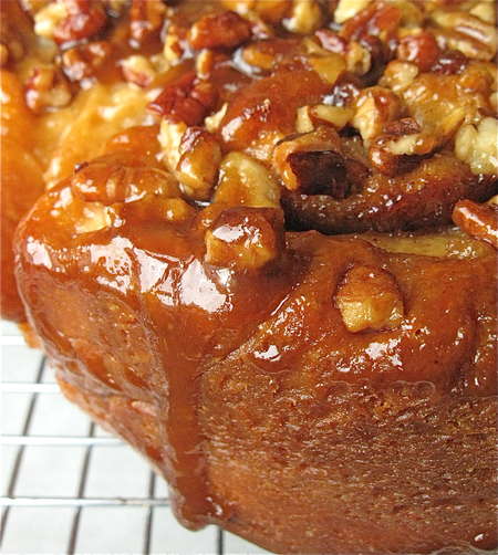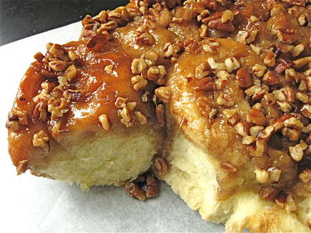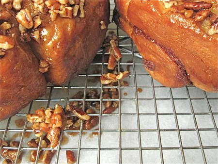 Here's another experiment I did. No sticky bun sugar on the left; see how the nuts slid off the buns? The sticky bun sugar keeps things "stuck" till the buns have cooled.