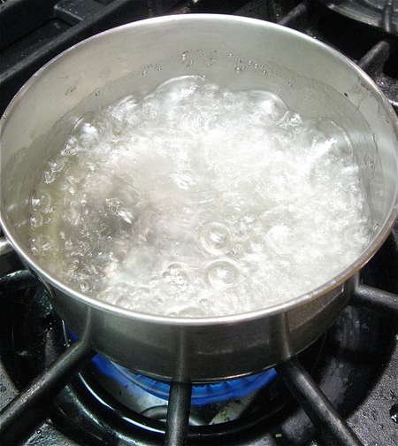 We'll begin with a Simple Freezer Sorbet. Boil water and sugar for 5 minutes to make a simple syrup. Remove from the heat, and chill in the fridge as you prepare the berries.