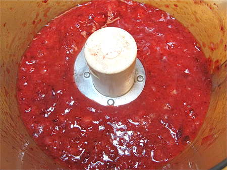 Whirl the berries in a food processor till they're basically liquefied, but still show quite a few chunks.