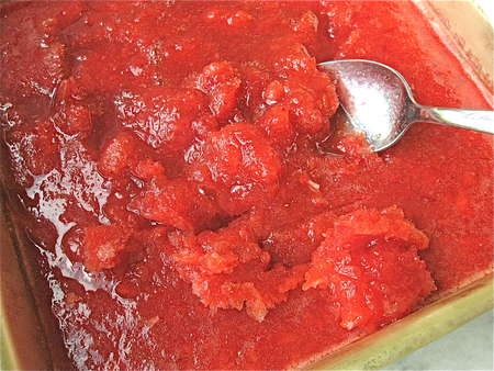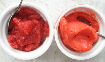 ’Tis true. Take fruit, sugar, water, and a touch of citrus juice; blend as though you're making a smoothie; freeze for about 4 hours, stirring two or three times; and there you have it: