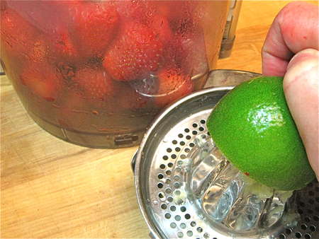 The following recipe came with the Cuisinart ice cream maker we use here in the King Arthur test kitchen. Start by squeezing 4 tablespoons of citrus juice—I love the strawberry-lime combo, so that's what I've chosen. Lemon or orange are also entirely apropos.