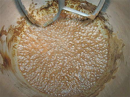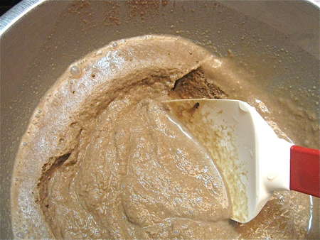 Stir in 2 cups (1 pint; 454g) heavy or whipping cream, and 1 teaspoon vanilla extract. You'll now have a tan-colored liquid with some cocoa detritus floating on top.