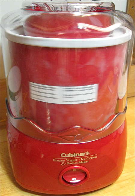 Turn on the ice cream maker. It'll whir and spin. Well, my Cuisinart does, anyway. If you have another model, it might act differently. And if you have an "Armstrong" (the old-fashioned crank style ice cream maker, for which you need “strong arms” to turn the handle), then any spinning is entirely up to you!