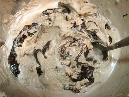 Whoops, side path. I had some leftover chocolate ganache, so I reheated just till it was pourable, and swirled some in.
