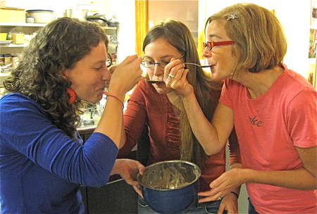 Three of our King Arthur merchandise team members, Liz, Emily, and Deb, asked to lick the bowl. You go, girls!