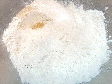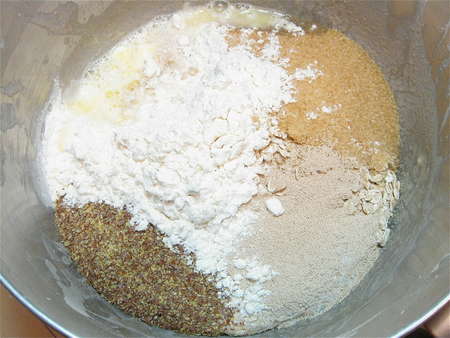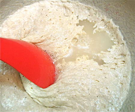 Read the note at the bottom of the list of ingredients below, about how much water to add. Then, combine with the starter in the bowl: