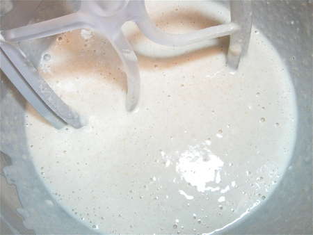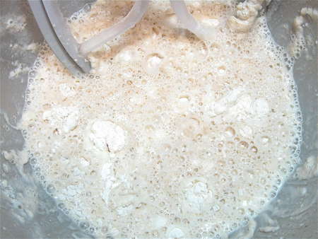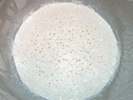 First, we'll make a starter. You can let this starter rest at room temperature anywhere from 4 hours to 2 days. Yes, 2 days; really, it's OK. It'll get bubbly, and then just sit there getting more and more tangy, and generating more and more liquid. More about that later.