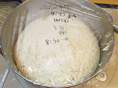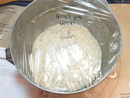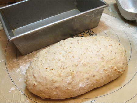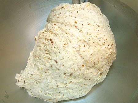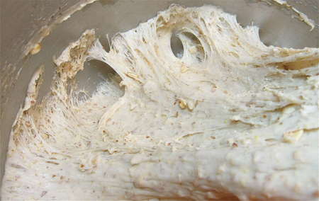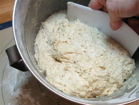 Scoop the dough out of the bowl, gently deflating it. Notice how nicely the gluten has developed, despite the whole grains.