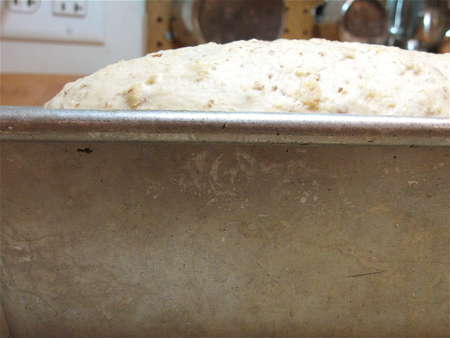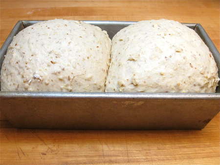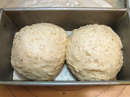Cover the pans, and let each loaf rise till it's crowned about 1” over the rim of the pan. This will take about 60 to 90 minutes. Towards the end of the rising time, preheat your oven to 350°F.
