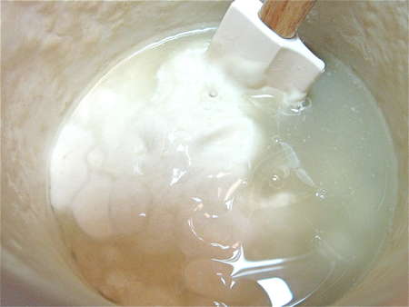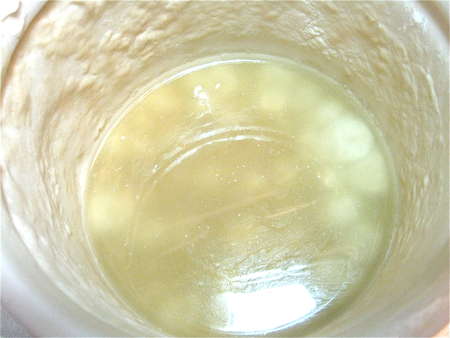 Pour off all but about 1/4” of the liquid on top, then stir the remainder into the dough beneath.