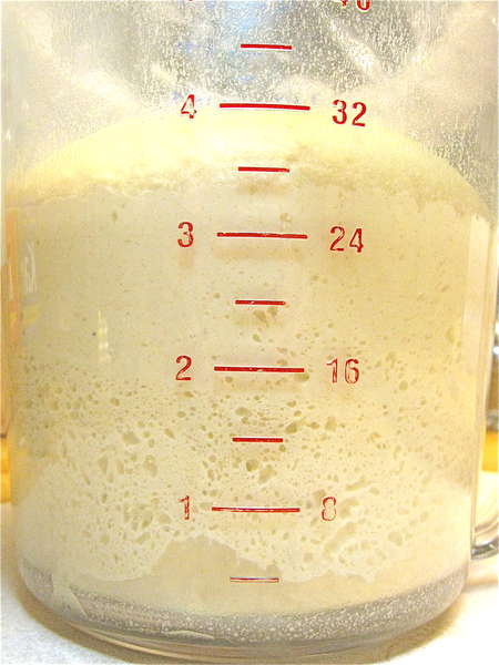 Before we start, let's examine some sourdough dynamics. The less-used your starter, the more liquid on top, the more sour it's likely to be. Using a starter that hasn't been fed for weeks (or months) will yield a pizza crust that rises slowly, and tastes quite tangy. This type of crust is handy when you want to make dough in the morning, and have pizza ready for dinner.