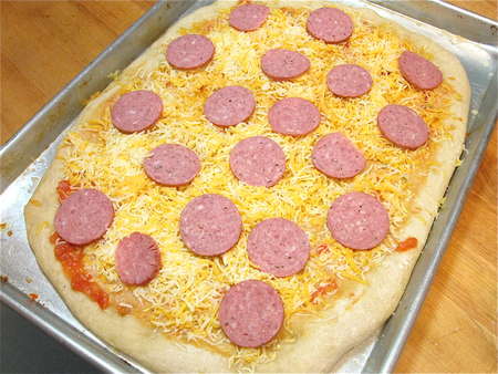 I like to put the pepperoni on top of the cheese – no reason, other than that I think it looks prettier.