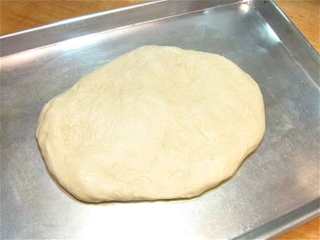 For a thicker-crust pizza, drizzle a half-sheet pan (18" x 13"), or similar sized pan; or a 14" round pizza pan with olive oil, tilting the pan to coat. Shape the dough into a flattened disk. Place it in the pan, cover it, and let it rest for 15 minutes.