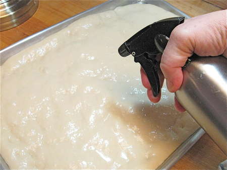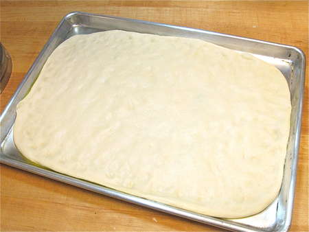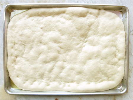 Push the dough towards the edges of the pan; when it starts to fight back, cover it and let it rest for 15 minutes.