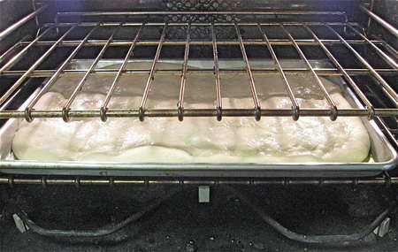 Cover the pan, and let the dough rise till it's as thick as you like. For thin-crust pizza made from fairly fresh starter, this may only be an hour or so. For thick-crust using an old, little-used starter, this may take most of the day. Keep in mind that this crust doesn't have a lot of oven spring; what you see going into the oven is pretty much what you'll get coming out.