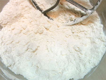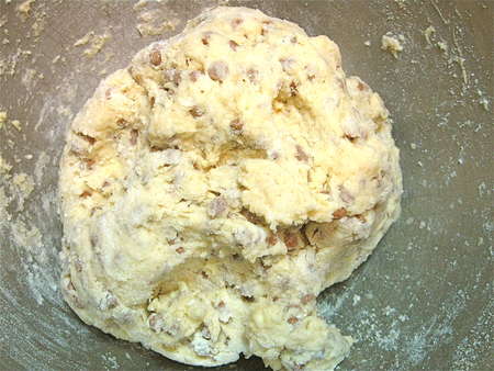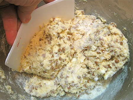 Stir until everything is moistened and holds together. A bowl scraper helps incorporate the dry stuff in the bottom of the bowl into the mass of dough.