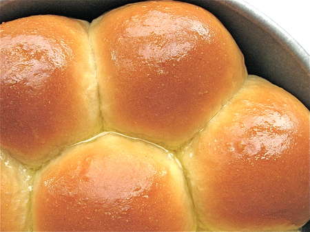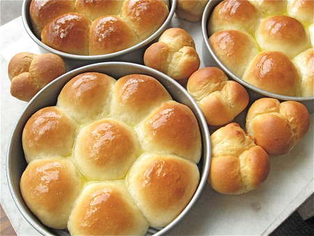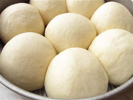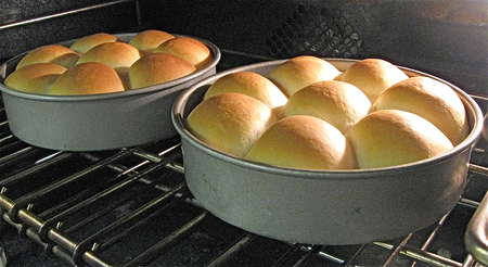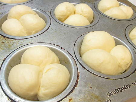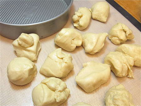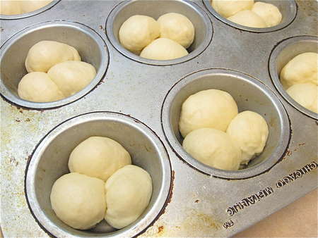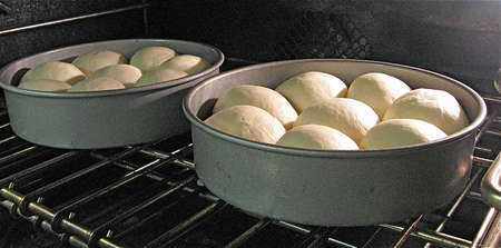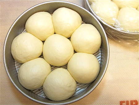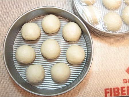 Lightly grease two 8” round cake pans, spacing eight balls in each. Can you use 9” round cake pans, or a 9” x 13” pan? Sure; the buns just won't nestle together as closely, so their sides will be a bit more baked. And they'll be a bit shorter in stature.