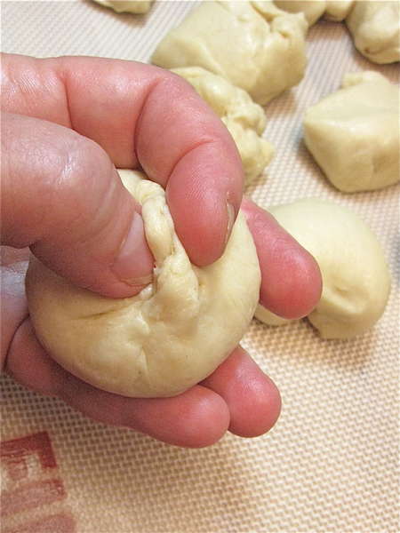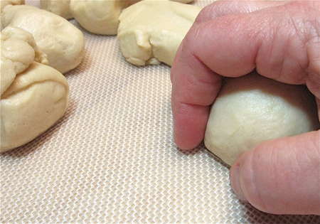 Knot-side down, gently roll the dough in circles beneath your curled fingers. No need to put pressure on it; just imagine the way you roll dice, cupping them in your hands and shaking. Same idea; the ball of dough will move freely under your hands.